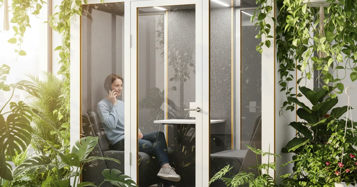Kryterium doboru: pełna izolacja 35 dB (żeby tło z open space nie trafiało do mikrofonu), mała powierzchnia (1,15 m² na kabinę — łącznie ok. 9 m² pod 8 sztuk), szybki montaż bez zamykania biura.